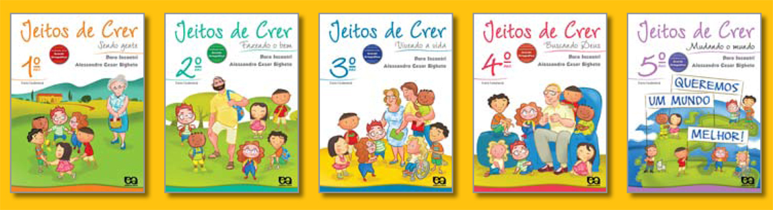 Jeitos de Crer, também pela Ática, continua a proposta do Todos os Jeitos de Crer, mas desta vez, para crianças menores (de 6 a 10). Alessandro e eu criamos personagens infantis, de diversas etnias, que estudam numa escola livre, como queríamos que todas as escolas fossem. Eles fazem viagens no tempo e no espaço, recebem visitas de personagens históricos, pesquisam, discutem, se emocionam e entrevistam personalidades reais. Junto, saiu um CD de música, gravado por mim, com músicas religiosas, regionais, internacionais, de grandes compositores (como Mozart e Beethoven) e algumas compostas por mim.
